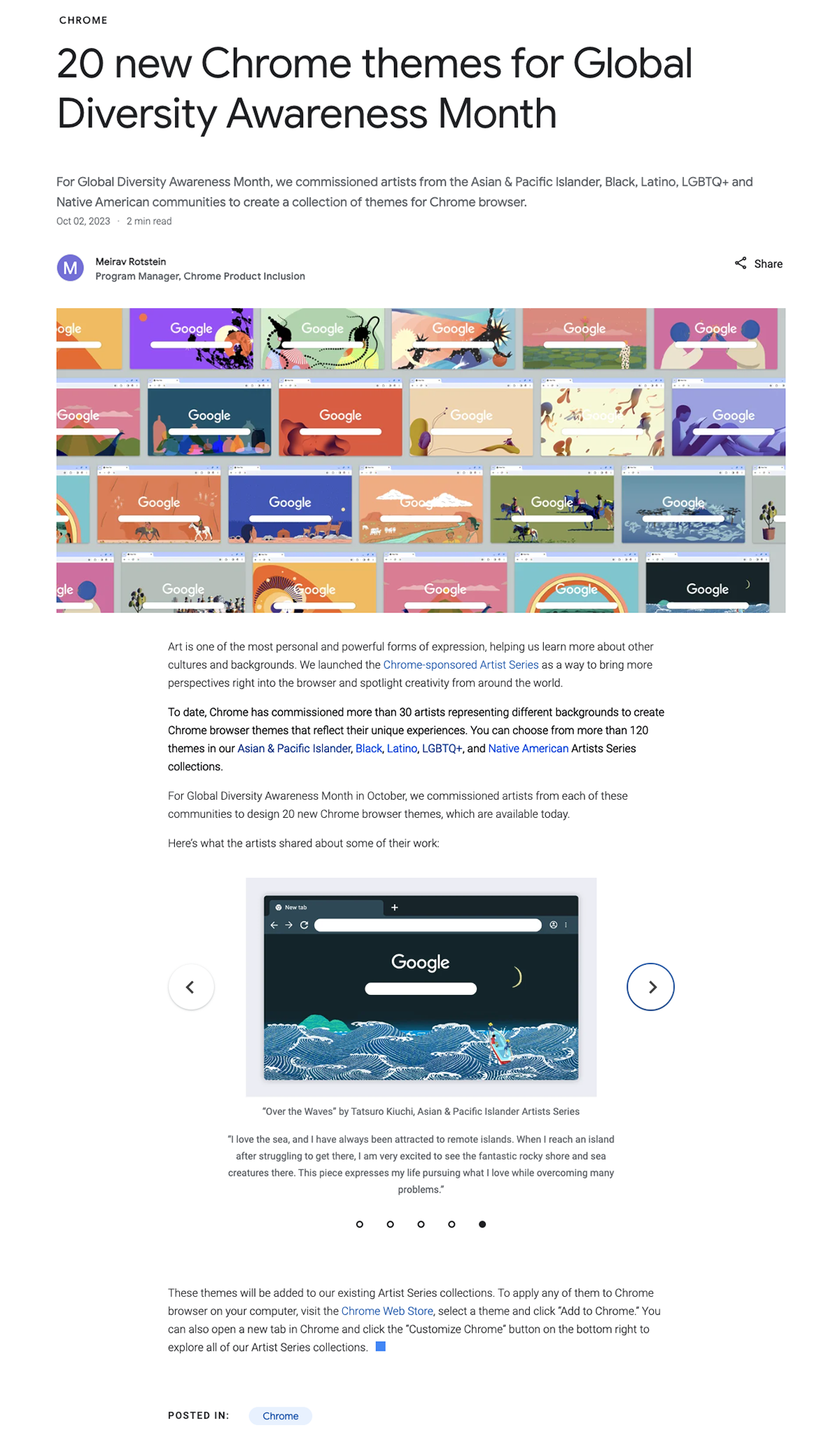 Chromeブラウザ用のテーマ・コレクションはGlobal Diversity Awareness月間にあたりAsian & Pacific Islander、Black、Latino、LGBTQ+、Native Americanの各コミュニティのアーティストにGoogleから依頼があり制作したものです。