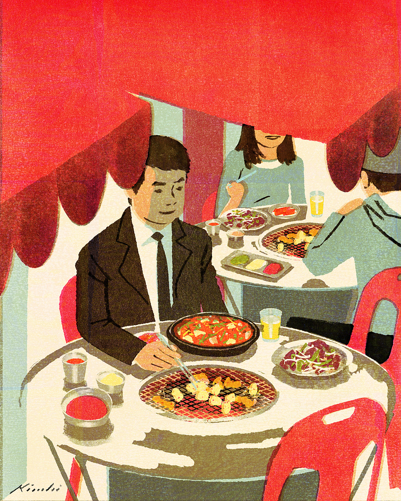 Illustrated Jeongbae Park, a columnist specializing in Korean food. He goes to venerable eateries in various regions and writes about the secrets of flavor. In this issue, he visits the town of Angirang, famous for its offal cuisine in Daegu, and introduces some of its famous restaurants.
